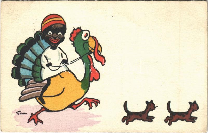 1913 Black boy rides a turkey. M. M. Vienne Nr. 244. (EK) https://www.darabanth.com/hu/397-Gyorsarveres/397.0/Kepeslapok/Neger~1000097/1913-Black-boy-rides-a-turkey-M-M-Vienne-Nr-244-EK~II2413085