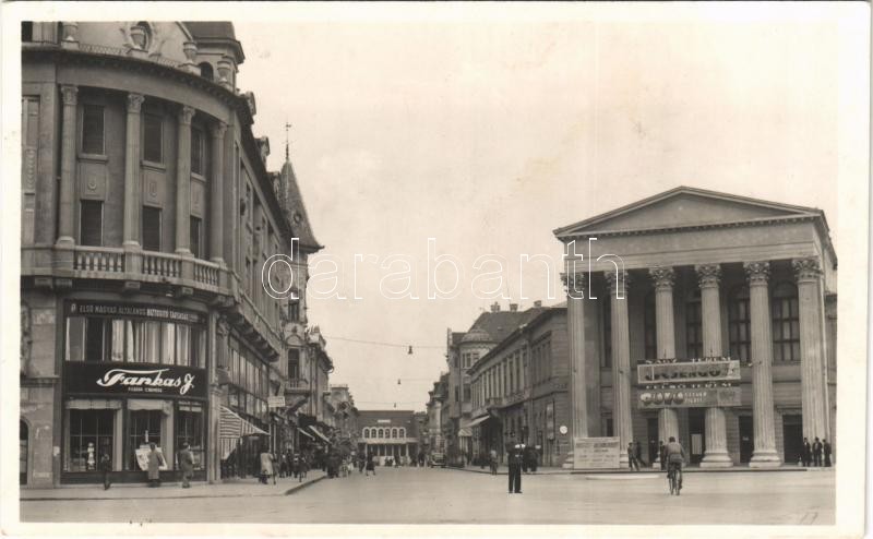 1943 Szabadka, Subotica; utca, Első magyar általános biztosító társaság, Farkas J. fűszer és csemege, művészest díszhangversenyest, üzletek / street, shops