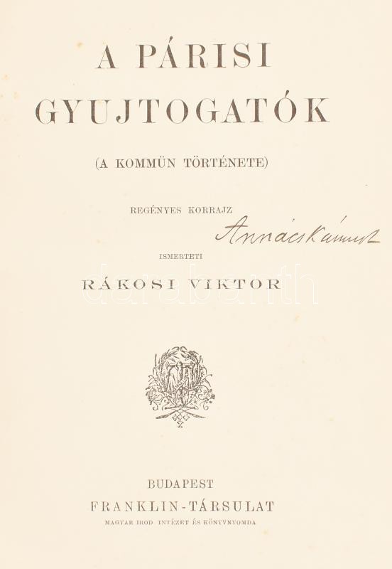 Rákosi Viktor: A párisi gyújtogatók. (A kommun története). Bp., [1911], Franklin-Társulat. 234 p. Lapszámozáson belül 32 táblával és szövegközti képekkel gazdagon illusztrálva. Kiadói illusztrált, aranyozott egészvászon-kötés, márványozott lapélekkel, kissé kopott borítóval, helyenként kissé foltos lapokkal.