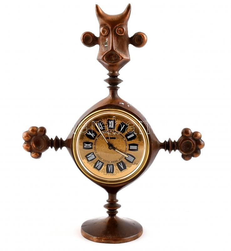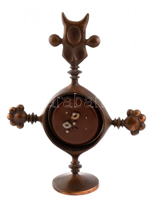 Leírás: Muharos Lajos: Iparművész réz asztali óra. jelzés nélkül, működő mechanikus szerkezettel. 35 cm