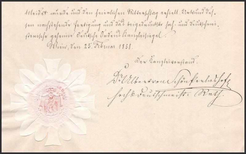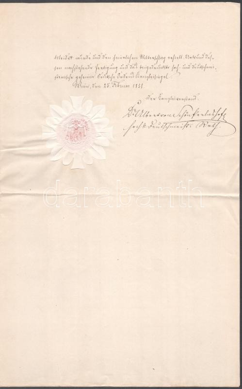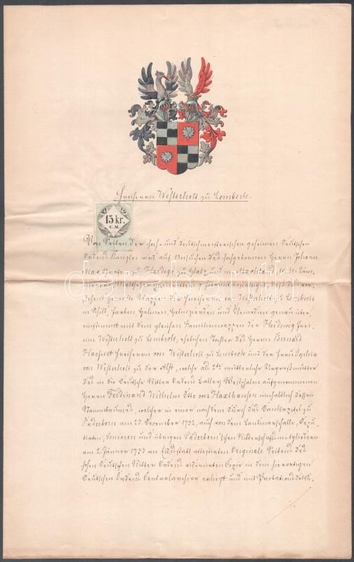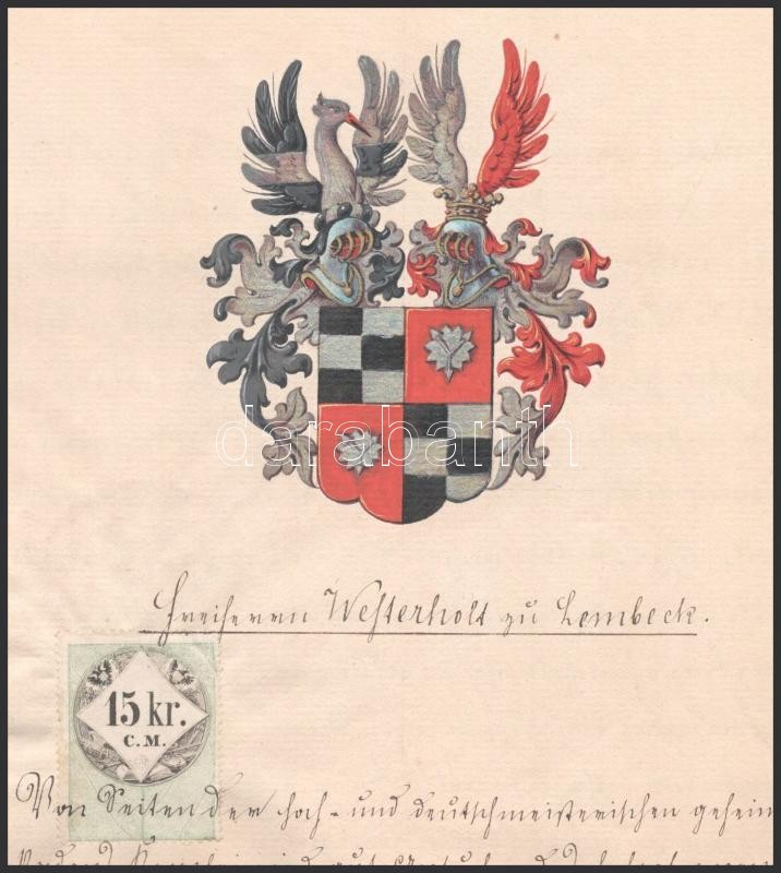 Leírás: 1858 A Westerholt-Lembeck család nemesi címerének levéltári igazolás, a család kézzel festett címerével. 22x36 cm