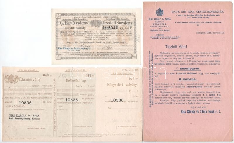 1916. "Magyar Kir. Szabadalmazott Osztálysorsjáték, 6. osztály, 1/8 Egy Nyolczad Eredeti Sorsjegy" felülbélyegzéssel + nyereménytáblázat + csekk a befizetéshez + hivatalos nyereményjegyzék + levél a cÃmzetthez T:I-III