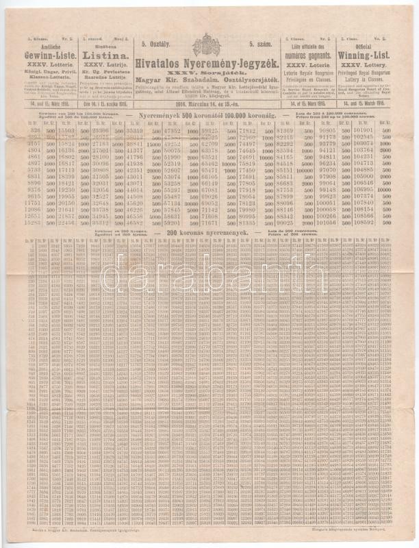 1916. "Magyar Kir. Szabadalmazott Osztálysorsjáték, 6. osztály, 1/8 Eg...