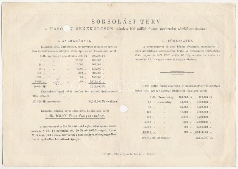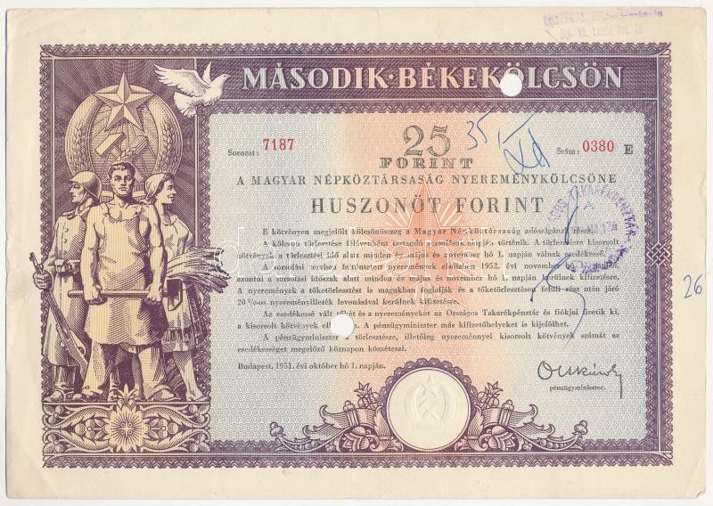Leírás: 1951. "Második Békekölcsön" nyereménykölcsön 25Ft-ról szárazpecséttel, bélyegzésekkel, lyukasztásokkal érvénytelenítve T:III