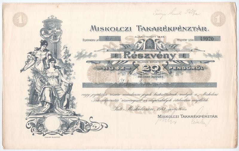 Leírás: Miskolc 1943. "Miskolczi Takarékpénztár" részvénye 20P-ről, szelvényekkel, szárazpecséttel T:II- / Hungary / Miskolc 1943. "Miskolczi Takarékpénztár" share about 20 Pengő with coupons and embossed stamp C:VF