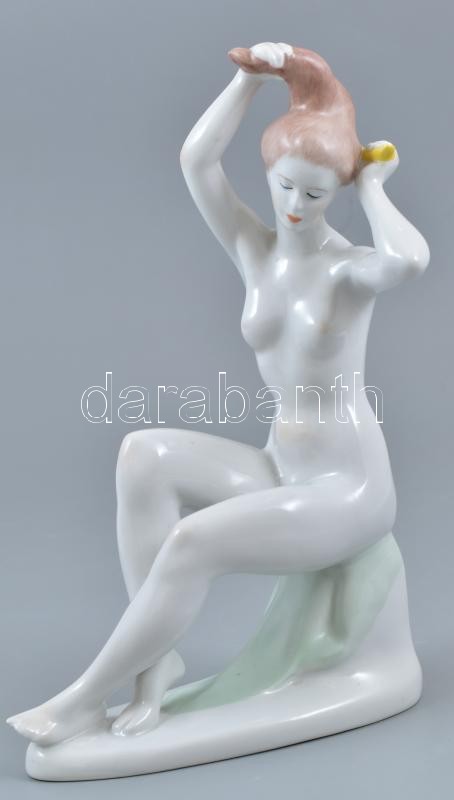 Leírás: Aquincumi porcelán fésülködő női akt, kézzel festett, jelzett, hibátlan, m: 22 cm