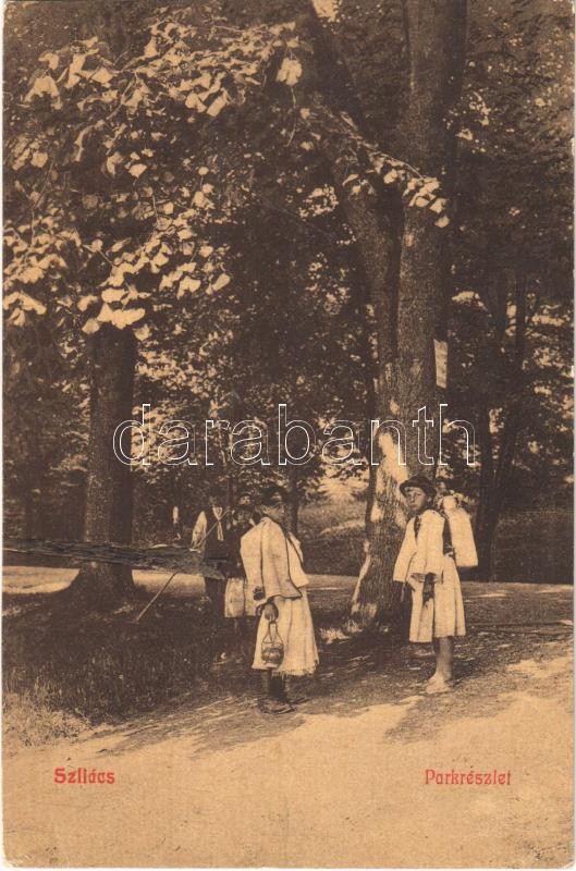 Leírás: 1911 Szliács, Sliac; Park részlet, folklór. 13. A "Magyar Bazár" Waktor Sámuel kiadása / park, folklore (EK)