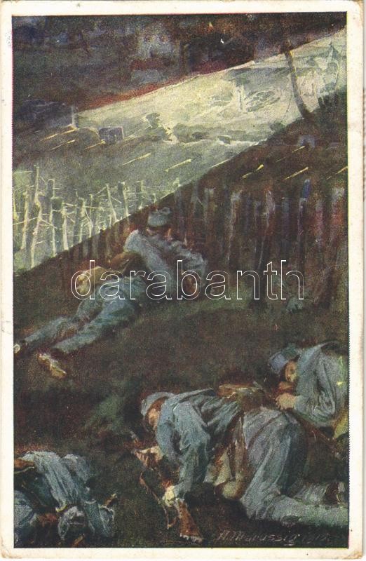 1916 Korporal Karl Rapp vom K.K. Landwehrinfanterieregiment Nr. 14. schleicht im Dunkel der Nacht in befestigte feindliche Stellungen. Er bringt wichtige Meldungen und einen Gefangenen zurück. Aus dem goldenen Buche der Armee Serie IV. Offizielle Karte für Rotes Kreuz, Kriegsfürsorgeamt Kriegshilfsbüro Nr. 374. / WWI Austro-Hungarian K.u.K. military art postcard, support fund s: Marussig (EK)