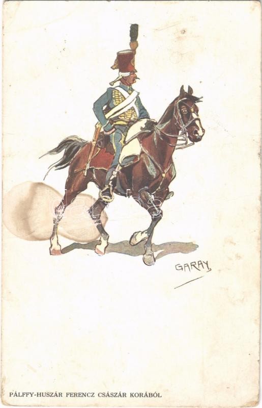 Pálffy-huszár Ferenc császár korából. A Magyar Huszár 3. Kiadja Kner Izidor könyvnyomdász / Austro-Hungarian K.u.K. military art postcard, Hungarian hussar s: Garay (lyuk / hole)