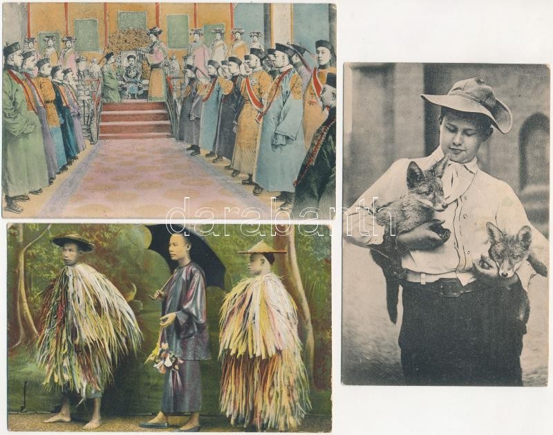 Leírás: 3 db RÉGI egzotikus képeslap: kínai és róka / 3 pre-1945 exotic postcards: Chinese and fox