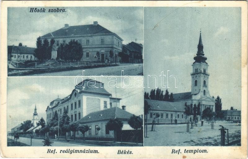 1932 Békés, Hősök szobra, emlékmű, Református templom és reálgimnázium... https://www.darabanth.com/hu/398-Gyorsarveres/398.0/Kepeslapok/Magyarorszag~1000004/1932-Bekes-Hosok-szobra-emlekmu-Reformatus-templom-es-realgimnazium-fa~II2430273