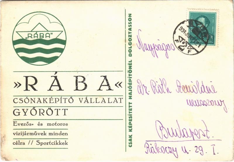 1934 Győr, "Rába" csónaképítő vállalat reklámlapja. "Evezős- és motoros vízijárművek minden célra, sportcikkek. Csak képesített hajóépítőnél dolgoztasson" (EB)