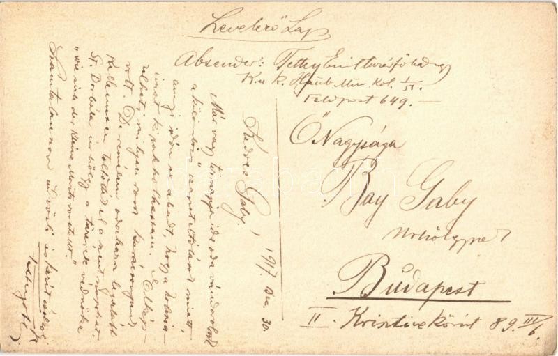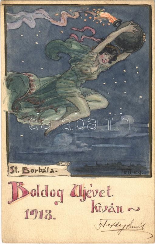 1917 Boldog Újévet kíván 1918. St. Borbála. Kézzel festett finoman erotikus / Hungarian New Year greeting, hand-painted gently erotic art postcard s: Tettey Emil