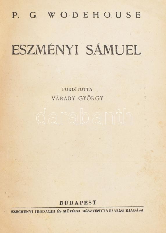 P. G. Wodehouse: Eszményi Sámuel. Bp., (1942), Széchenyi. Első kiadás. Félvászon kötésben, kissé kopott gerinccel és borítóval, címlapot követő lapon tulajdonosi bélyegzővel, helyenként kissé foltos lapokkal..
