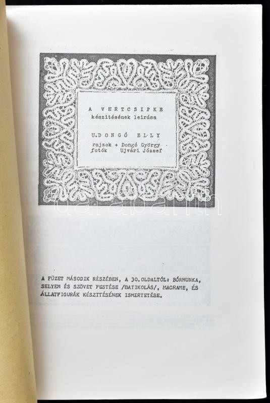 U. Dongó Elly: A vertcsipke készítésének leírása. H.n., é.n., k.n. Dongó György rajzaival és Ujvári József fotóival illusztrálva. Papírkötésben, jó állapotban. Fénymásolt.