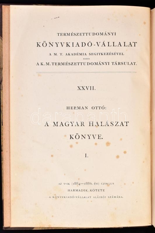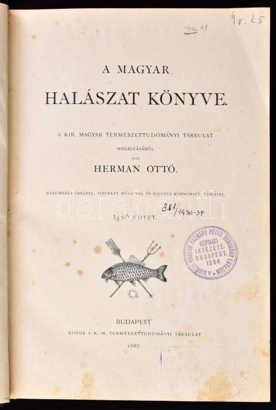 Herman Ottó: A magyar halászat könyve. I. köt. Bp, 1887., K. M. Természettudományi Társulat, XV + 552 p.+12 t. Átkötött félvászon-kötés, kissé kopott borítóval, intézményi bélyegzővel, néhány kissé foltos lappal, négy-öt javított lappal.