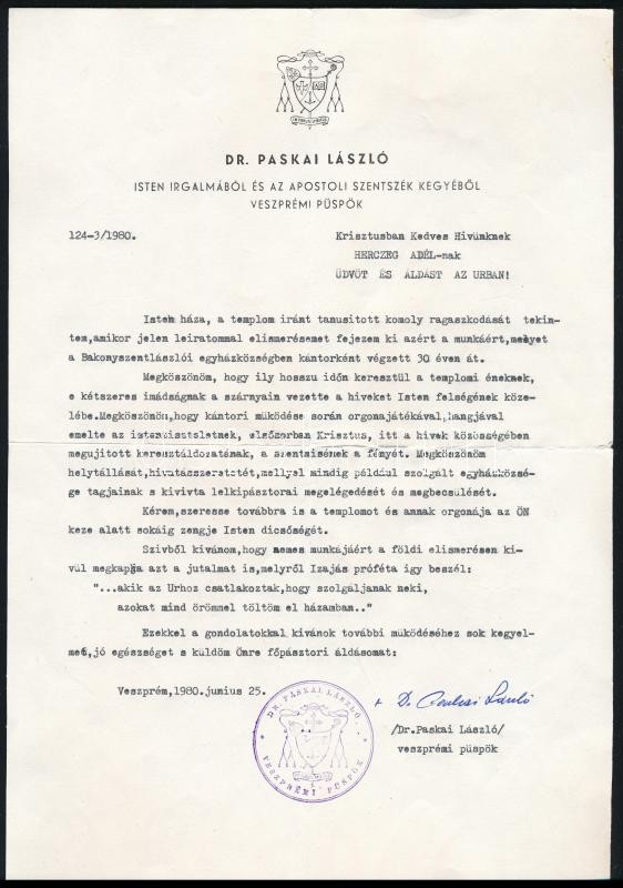 Leírás: Paskai László veszprémi püspök aláírása levélen