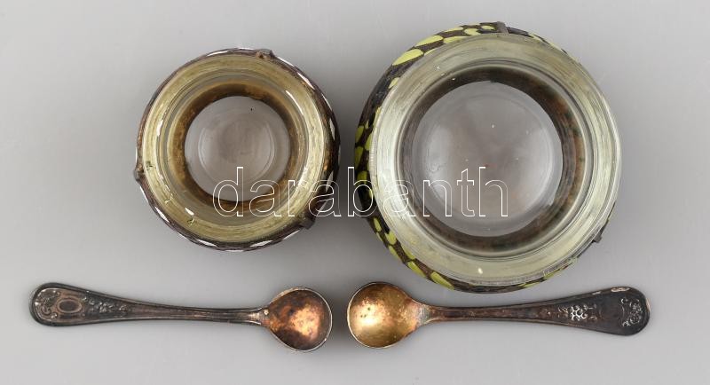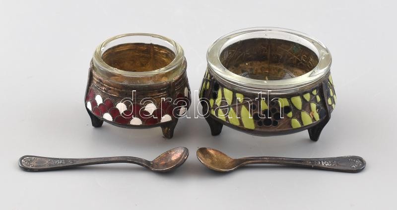 Leírás: 2 db zománcozott orosz kaviár tartó, üveg betéttel, kis kanállal d: 6 cm, d: 4 cm