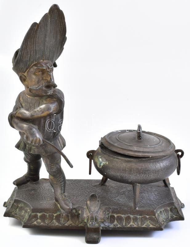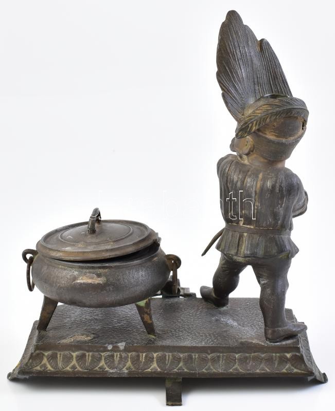 Leírás: Antik ón figurális toll- és tintatartó, jelzett, az üst fedele lejár, 19x12x23 cm