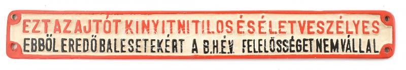 Fém tábla "Ezt az ajtót kinyitni tilos és életveszélyes. Ebből eredő balesetekért a B.H.É.V. felelősséget nem vállal." felirattal, kissé kopott, 4x31 cm