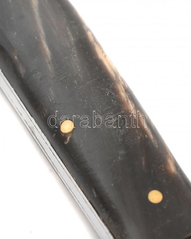 Leírás: Körmöző bicska, szaru nyéllel, apró kopásnyomokkal, nyélen egy egészen apró csorbával, h: 16 cm