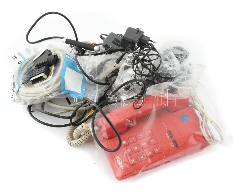 Leírás: Nagy kábel és alkatrész tétel: tápkábelek, utp kábel, usb, hangkábelek, adapterek. gombos telefon