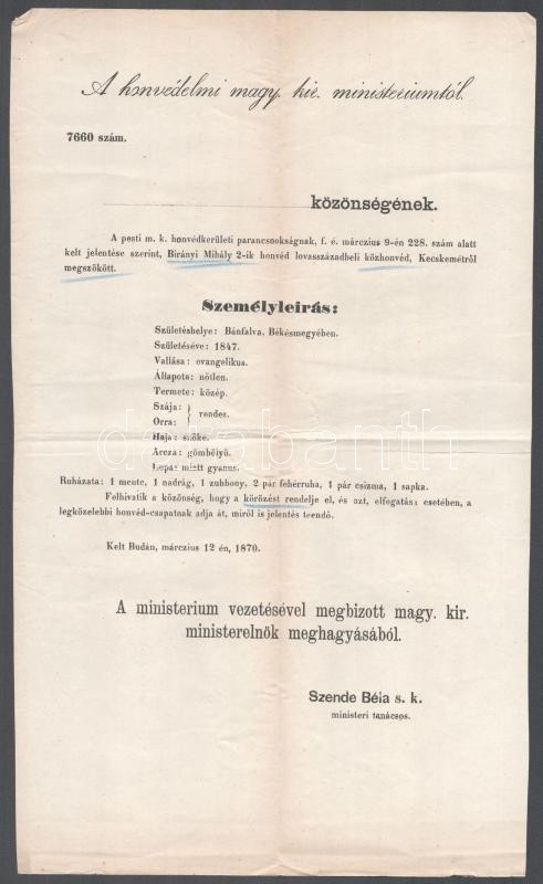 Leírás: 1870 Honvéd katonaszökevény köröző levele