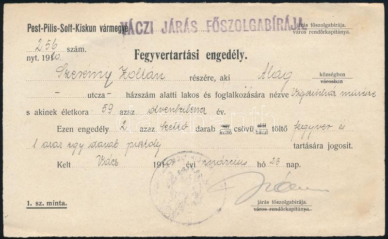 1910 Fegyvertartási engedély https://www.darabanth.com/hu/398-Gyorsarveres/398.0/Mutargy-papirregiseg-egyeb/Militaria~500029/1910-Fegyvertartasi-engedely~II2425503