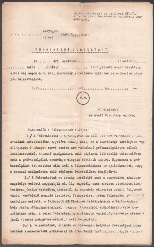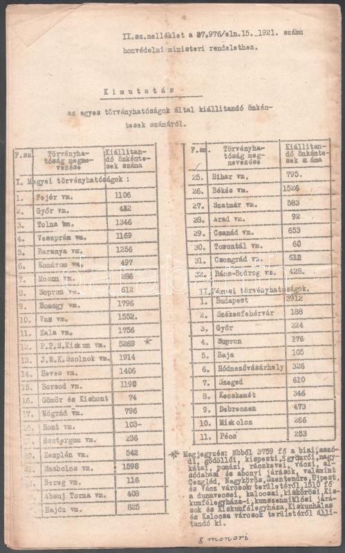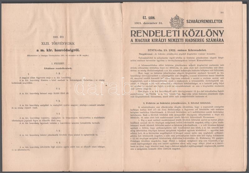 1921 A Magyar Királyi Honvédség felállításával kapcsolatos hivatalos rendeletek gyűjteménye: 1921 XLIX. tc A m kir honvédségről, Rendeleti közlöny az önkéntesek felhívásával, Honvédelmi miniszteri rendelet a törvényhatóságok által kiállítandó újoncokról + a rendelethez tartozó formanyomtatványok melléklete