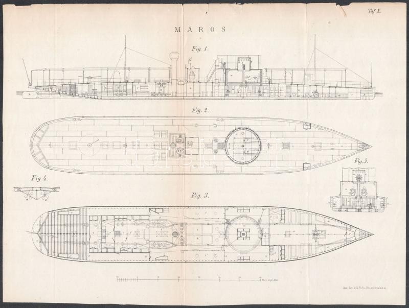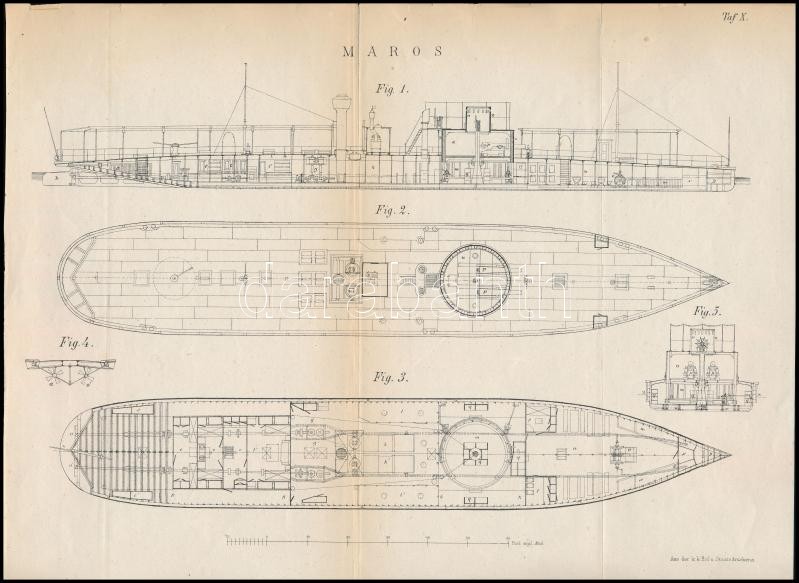 A MAROS és LEITHA dunai monitorok Josef von Romako által 1870-ben készített tervrajzának 1873-ban kiadott példánya, korához képest jó állapotban, 22x30 cm