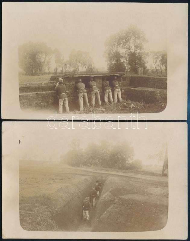 Leírás: cca 1912 Magyar katonák gyakorlatozása lövészárokban, 2 db fotó, jó állapotban, 8,5×13,5 cm