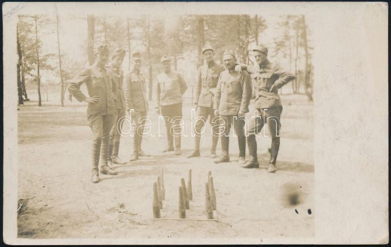 Leírás: cca 1915 Magyar katonák a fronton kézzel faragott tekebábuk körül, fotó, 8,5×14 cm