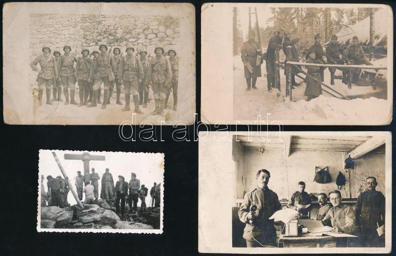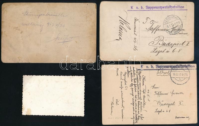 Leírás: cca 1917-1940 4 db katonai fotó, kettő K. u. k. Sappeurspezialbataillon pecséttel, felületükön törésnyomok, 6×9 és 9×14 cm