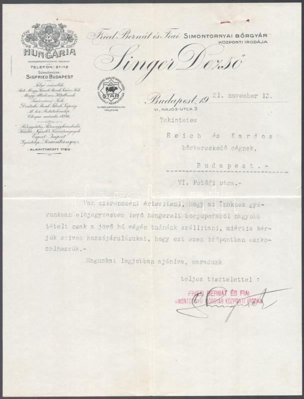 1921 Bp., Fried Bernát és Fiai Simontornyai Bőrgyár központi irodája S... https://www.darabanth.com/hu/398-Gyorsarveres/398.0/Mutargy-papirregiseg-egyeb/Okmanyok~500019/1921-Bp-Fried-Bernat-es-Fiai-Simontornyai-Borgyar-kozponti-irodaja-Singer-Dezso-fejleces-l~II2430305