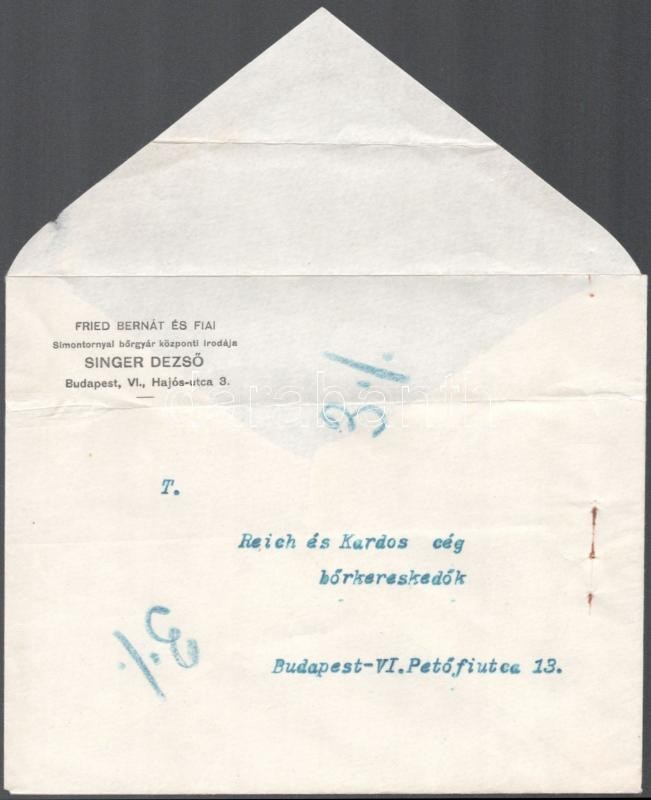 Leírás: 1921 Bp., Fried Bernát és Fiai Simontornyai Bőrgyár központi irodája Singer Dezső fejléces levélpapírjára írt levél + boríték