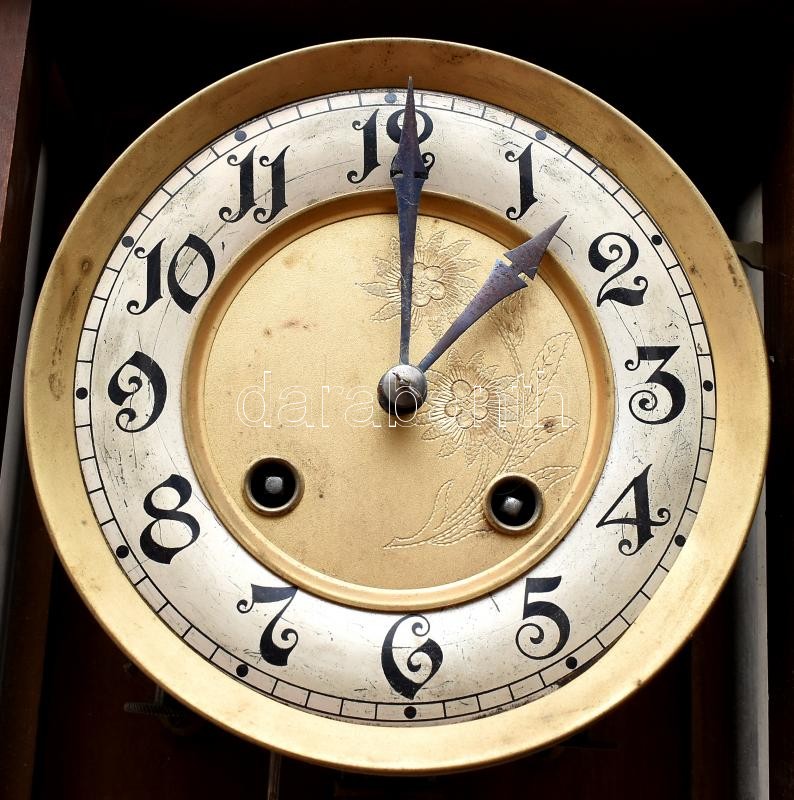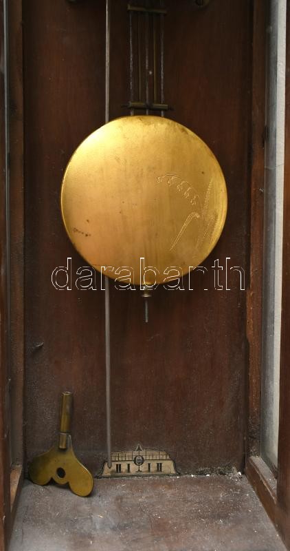 Braunswetter János Szeged felesütős, ingajáratos falióra XX: sz. eleje. Zárható szekrénnyel kulcs nélkül, felhúzó kulccsal egy oldalsó üveg törött. 65x21 cm