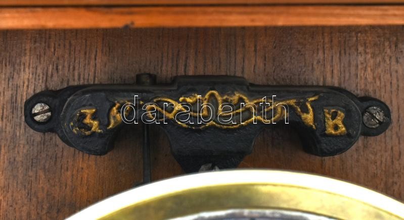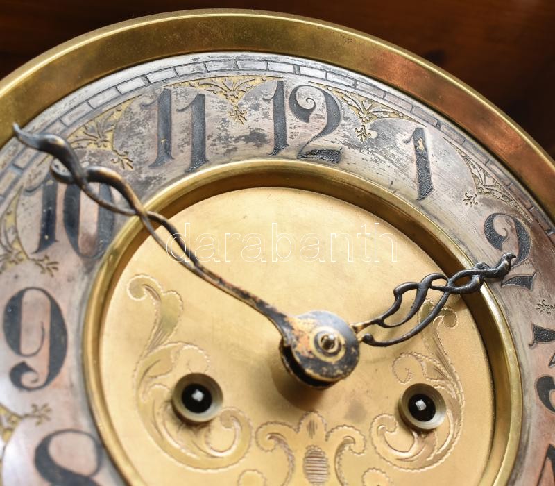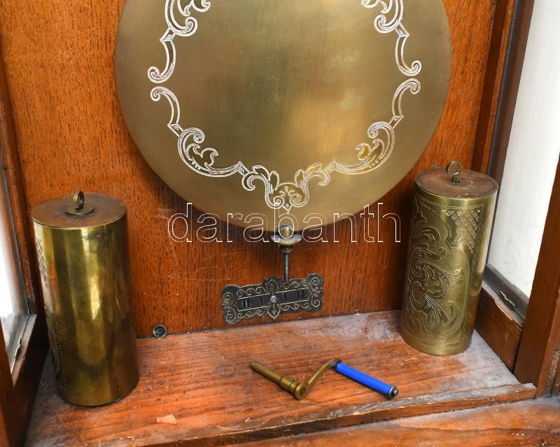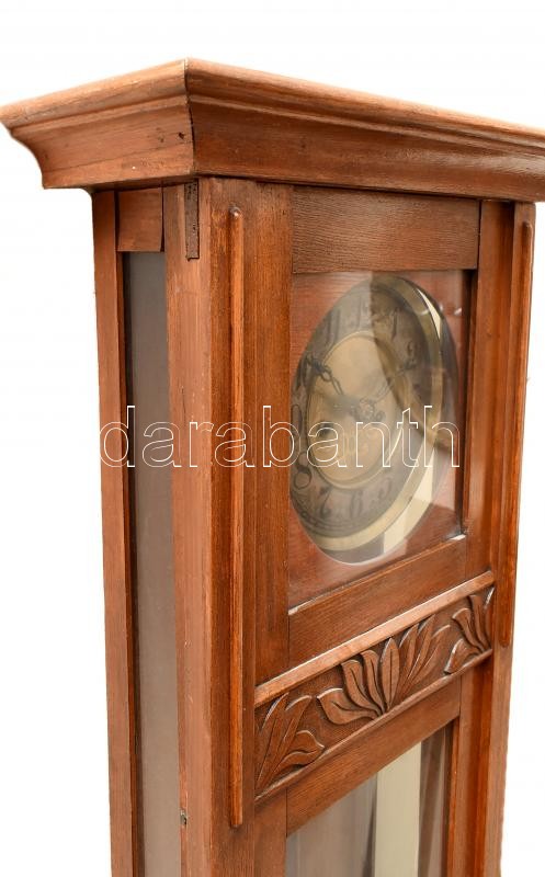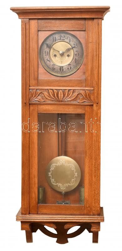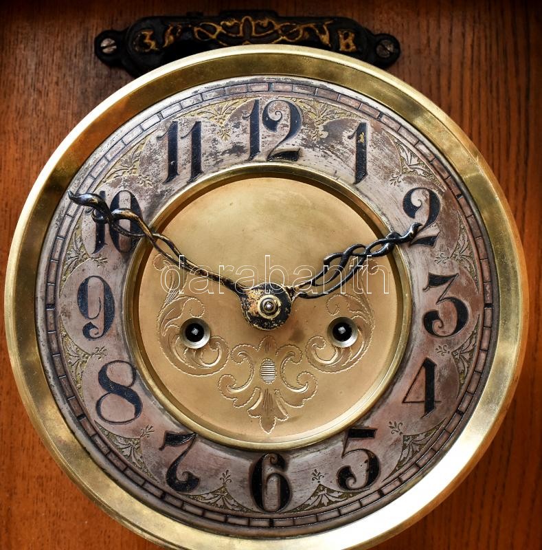 Nagy méretű felesütős, igajáratos falióra, szép tokkal, fazettált üvegekkel, vésett réz számlapokkal, súlyokkal. Kulccsal, működőképes állapotban. 90 cm