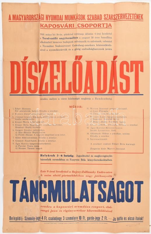 1948 Magyarországi Nyomdai Munkások Szabad Szakszervezetének kaposvári csoportjának díszelőadása és táncmulatsága, plakát, hajtott, szakadásokkal, 95×62 cm