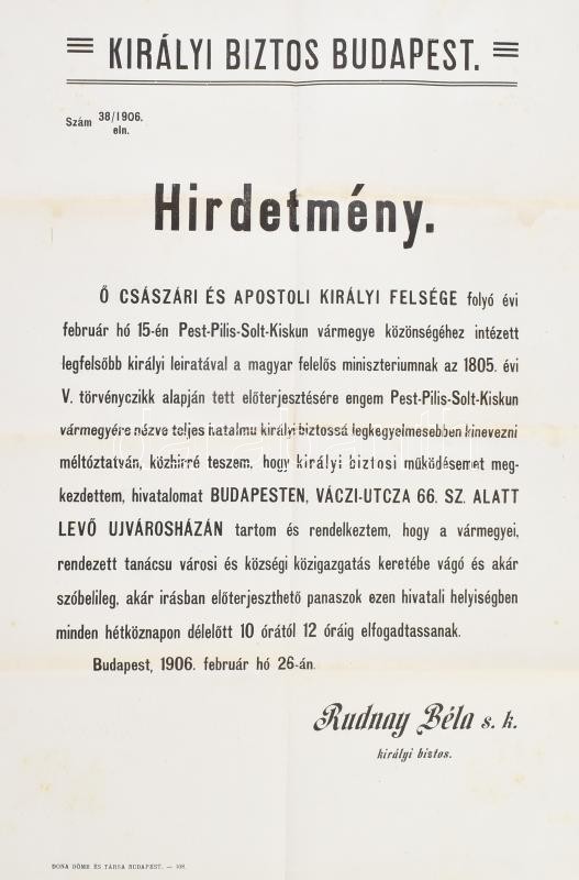 Leírás: 1906 Rudnay Béla királyi biztos működésének kezdetét bejelentő hirdetménye 46x30 cm