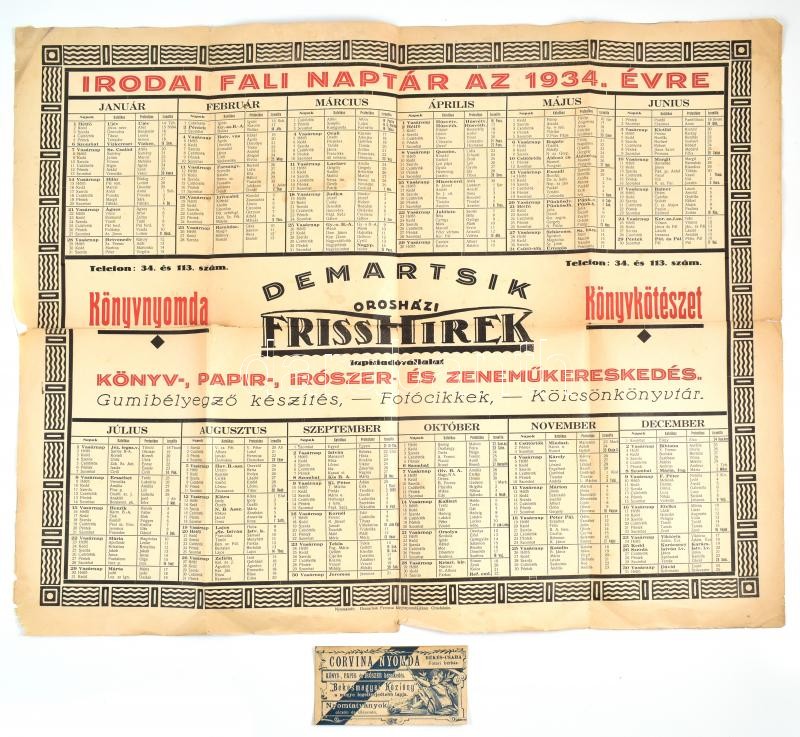 Leírás: 1934 Az orosházi Demartsik cég fali naptár lakátja szakadással 56x70 cm + a békéscsabai Corvina nyomda reklám kártyája