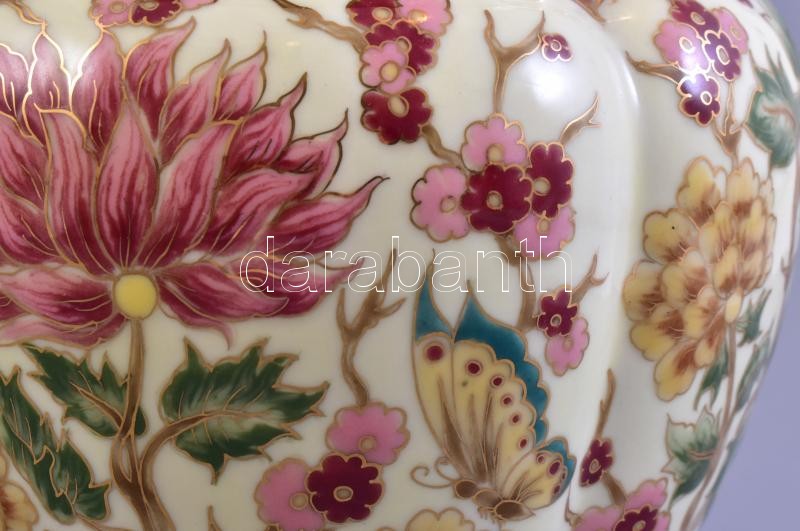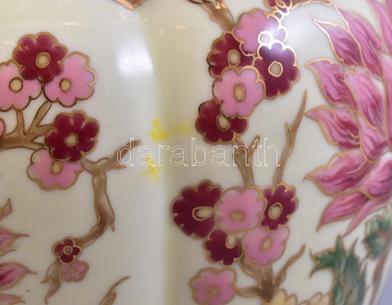 Leírás: Zsolnay virág mintás áttört kaspó. Kézzel festett, jelzett (Männerné), egyébként hibátlan. d:19 cm, m:17 cm