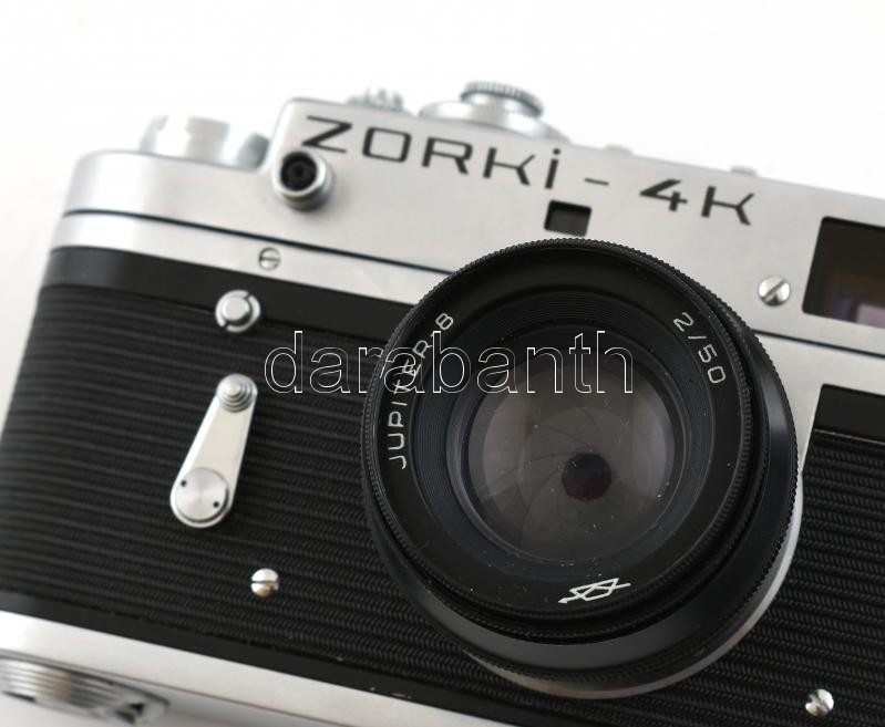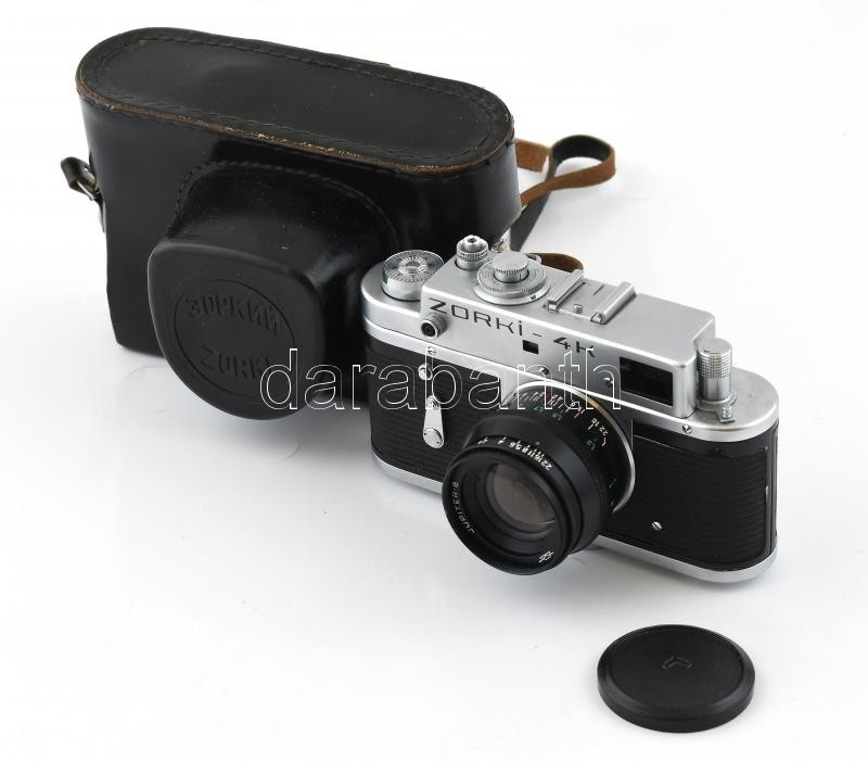 Zorkij-4 szovjet fényképezőgép, Jupiter-8 50 mm f/2 objektívvel, eredeti bőr tokjában, kissé kopottas / vintage Russian camera in original leather case
