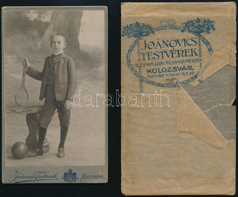 cca 1900 Kisfiú teniszütővel és labdával, keményhátú fotó a Joánovics testvérek műterméből, szecessziós hátlappal, tárolótasakkal (szakadt), 10,5×6,5 cm