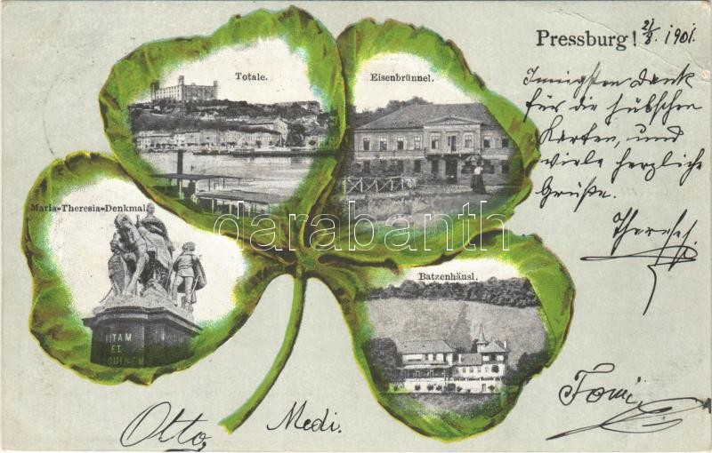 1901 Pozsony, Pressburg, Bratislava; Vaskutacska, Mária Terézia szobor, III. Bimbóház vendéglő, étterem. Szecessziós montázs lóherével / Eisenbrünnel (Eisenbründl), Batzenhäusl / restaurant, statue. Art Nouveau montage with clover (EB)