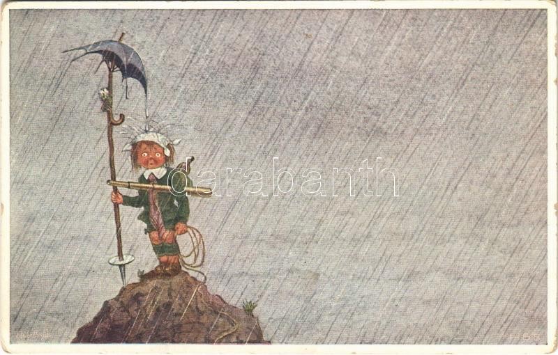 Leírás: Children art postcard, boy hiking in the mountains. Raphael Tuck & Sons "Oilette" Serie "Sommerurlaub im Gebirge" No. 985. s: H.S.B. (EK)