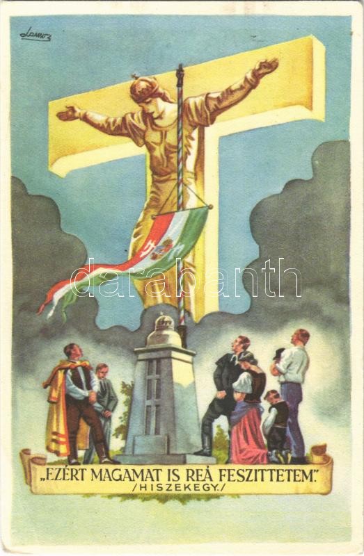 Leírás: 1937 Ezért magamat is reá feszíttetem. Hiszekegy. Kiadja az Ereklyés Országzászló Nagybizottsága / Hungarian irredenta propaganda, Hungarian flag, Trianon s: Lamoss (EB)