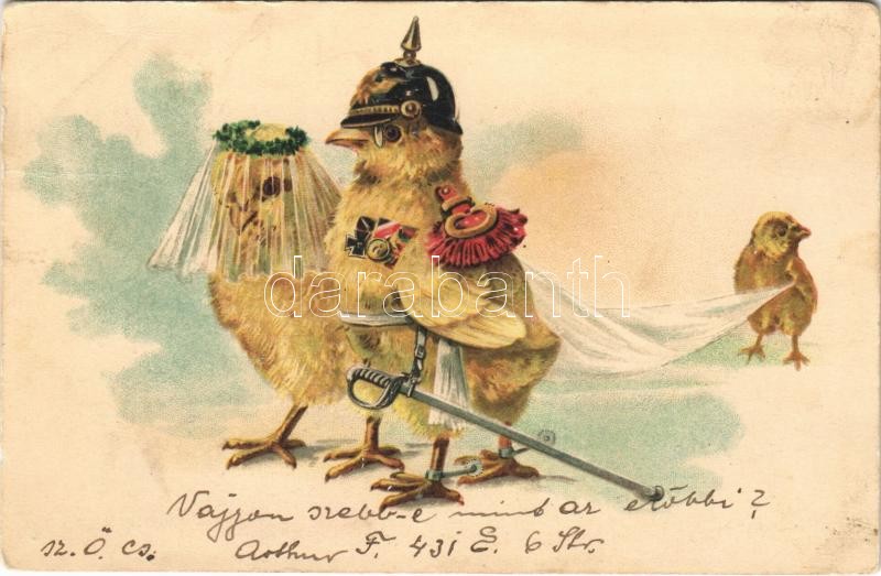 1905 German military, officer chicken's wedding. litho (Rb) https://www.darabanth.com/hu/399-Gyorsarveres/399.0/Kepeslapok/Katonai~1000068/1905-German-military-officer-chickens-wedding-litho-Rb~II2445418
