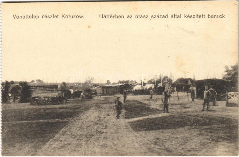 Vonattelep részlet Kotuzow. Háttérben az utász század által készített barakk. Kiadja a M. kir. 10. honvéd gyalogezred / WWI Austro-Hungarian K.u.K. military, field railway near Kotuziv (Ukraine), military barracks (fl)