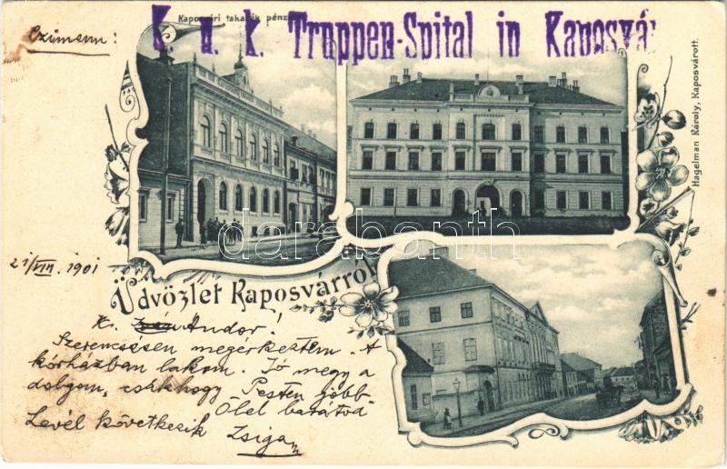 Leírás: 1901 Kaposvár, takarékpénztár. Hagelman Károly kiadása. Art Nouveau, floral