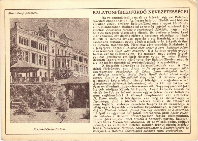 Leírás: Balatonfüred, Város nevezetességei: Erzsébet szanatórium. Farkasfalvi Kornél kiadása (EK)